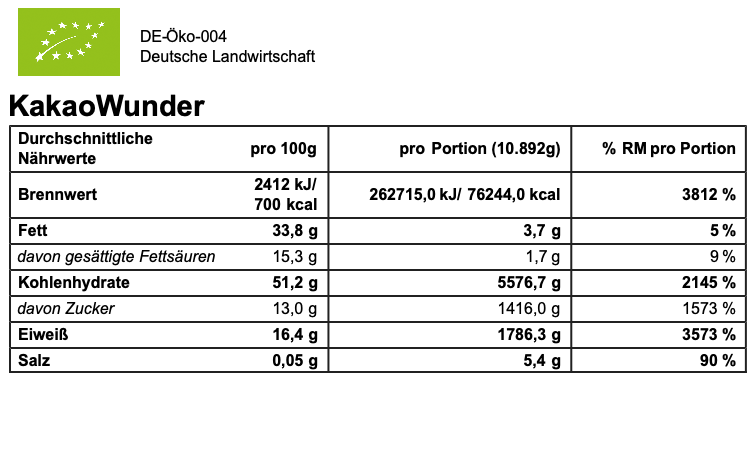 Bio glutenfreie Haferflocken, Bio gepuffter Amaranth, Bio gepuffter Quinoa, Bio Kürbiskerne, Bio Sonnenblumenkerne, Bio Chiasamen, Bio Pistazien (Nüsse), Bio Erdmandeln, Bio Kokosöl (Nüsse), Bio Agavendicksaft, Bio Kakaonibs, Bio Kakaopulver, Bio Ahornsirup